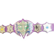 The immortal heavyweight championship belt stands out with its bold design and premium craftsmanship. The vibrant purple strap catches the eye. Center plate features striking artwork and polished silver details. Side plates display custom designs for a unique appearance. Made with heavy-duty materials, this belt feels solid in hand.